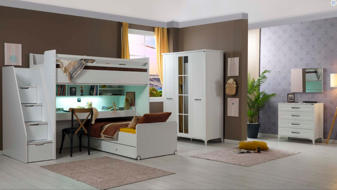 Celle que vous pouvez voir sur les photos est une excellente chambre pour meubler la chambre de votre enfant car, étant pleine d'étagères, de compartiments et de tiroirs, elle vous donne la possibilité d'organiser au mieux les vêtements, les chaussures, les livres et tout le reste, même en ayant une chambre de petite ou moyenne taille disponible.