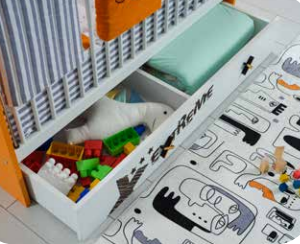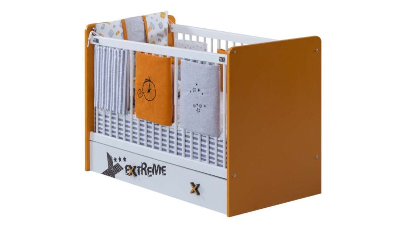 Cameretta completa per neonati "Extreme" stile modern street colore grigio, arancio, nero e legno con letto evolutivo.