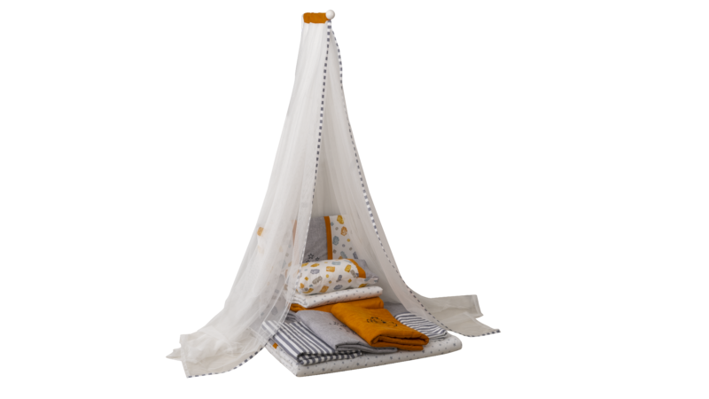 n. 1 set biancheria: trapunta (cm: 150x215), cuscino, lenzuolo, paracolpi, zanzariera colori grigio e arancio